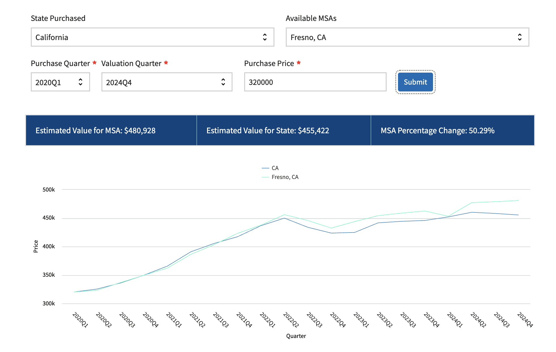 For example, a house purchased in the first quarter of 2020 for $320,000 in the region of Fresno, California, would have an estimated value of $480,928 in the fourth quarter of 2024. As you can see in the image below, this is a 50.29% increase in the property’s value since the time it was purchased.