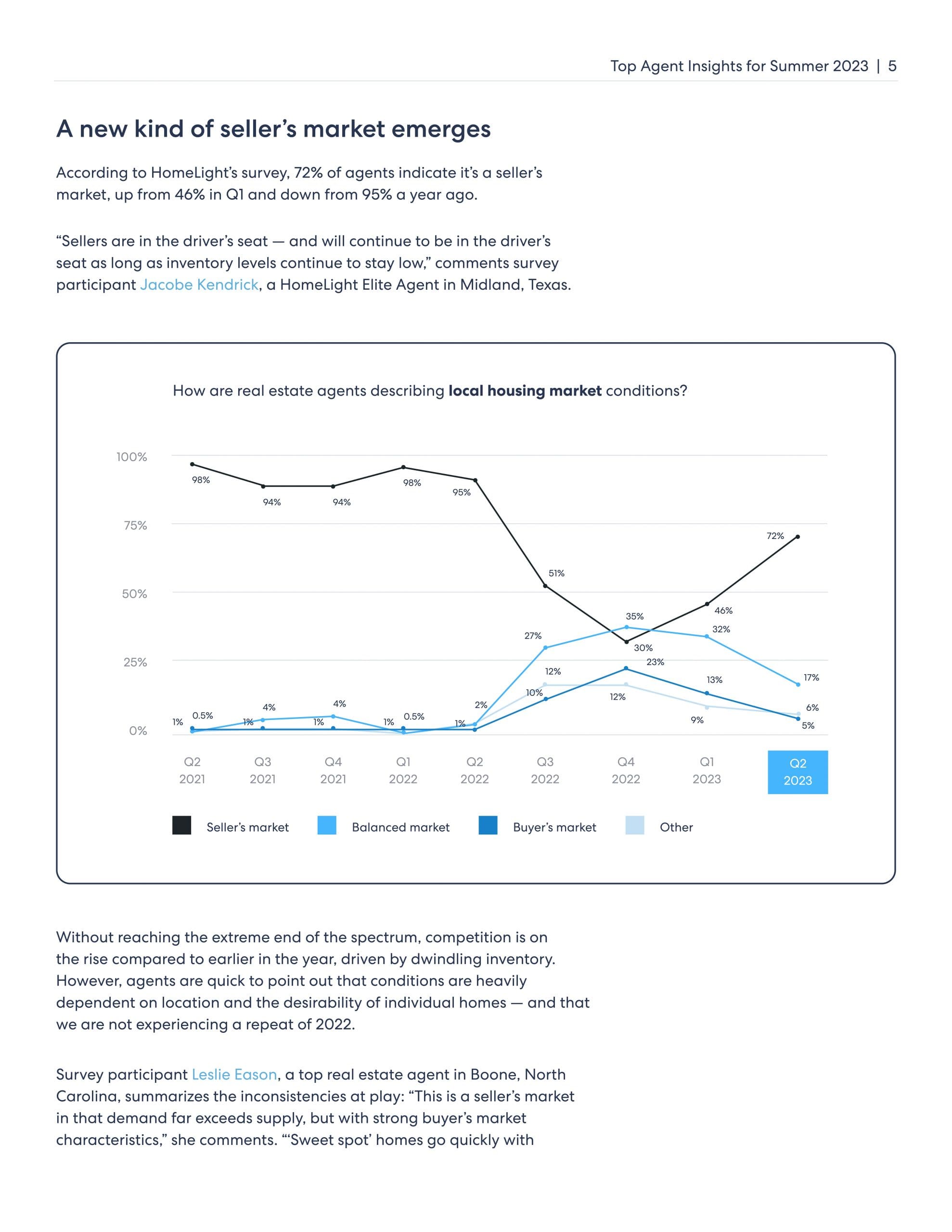 HomeLight’s Top Agent Insights Survey for Summer 2023 was fielded between May 18-June 7, 2023, through an online poll of 909 top real estate agents across the country. Agents were selected to participate in the survey based on the same performance data HomeLight uses to identify top real estate agents for over a million homebuyers and sellers nationwide.