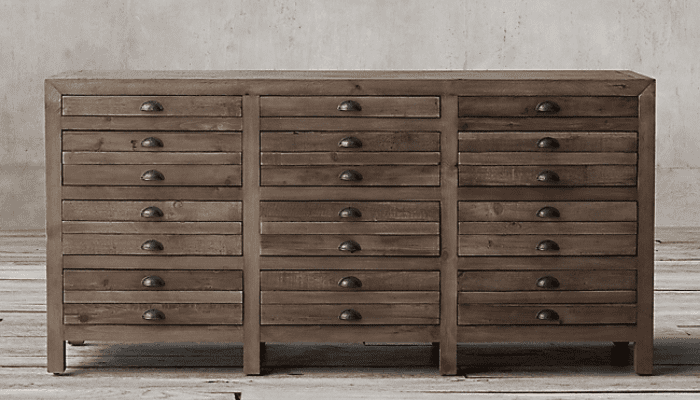 Restoration Hardware’s Cayden Campaign glass sideboard and hutch costs over $8,000, but Wayfair sells a reclaimed pine version of the four-drawer sideboard and hutch for just over $1,000.
