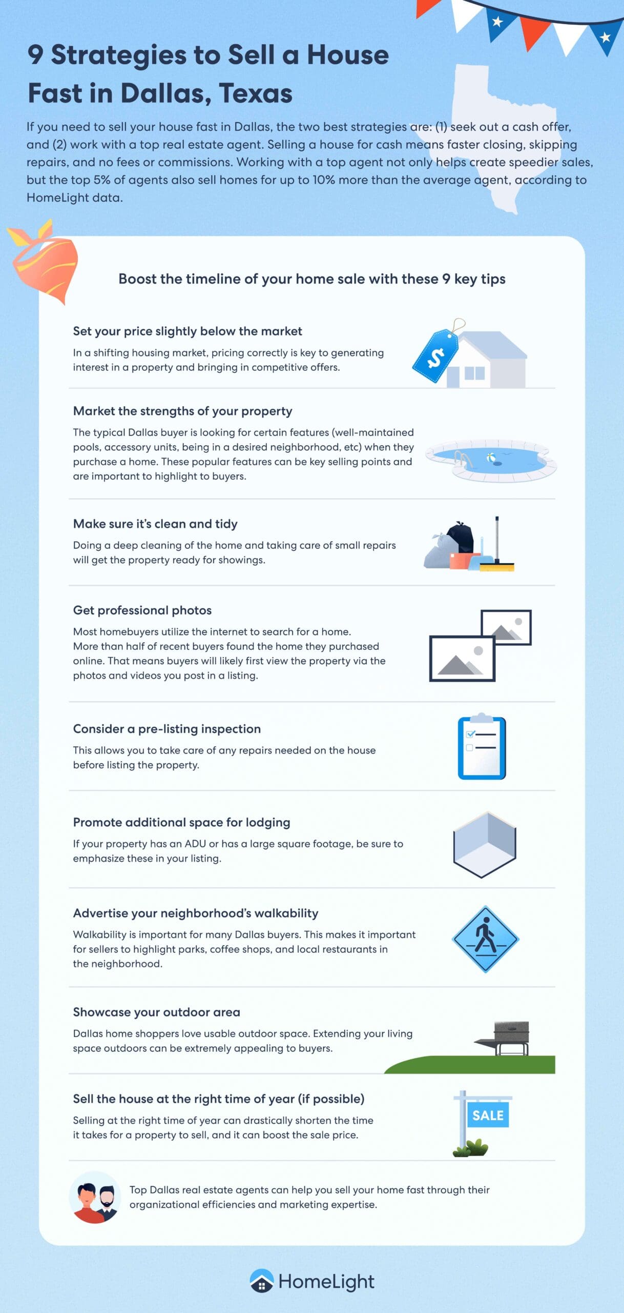 The typical Dallas buyer is looking for certain features when they purchase a home. Popular features can be a key selling point. Make sure you highlight these. Melnick says that attributes, such as well-maintained pools, accessory units, and being in a desired neighborhood, can help with a quick sale.