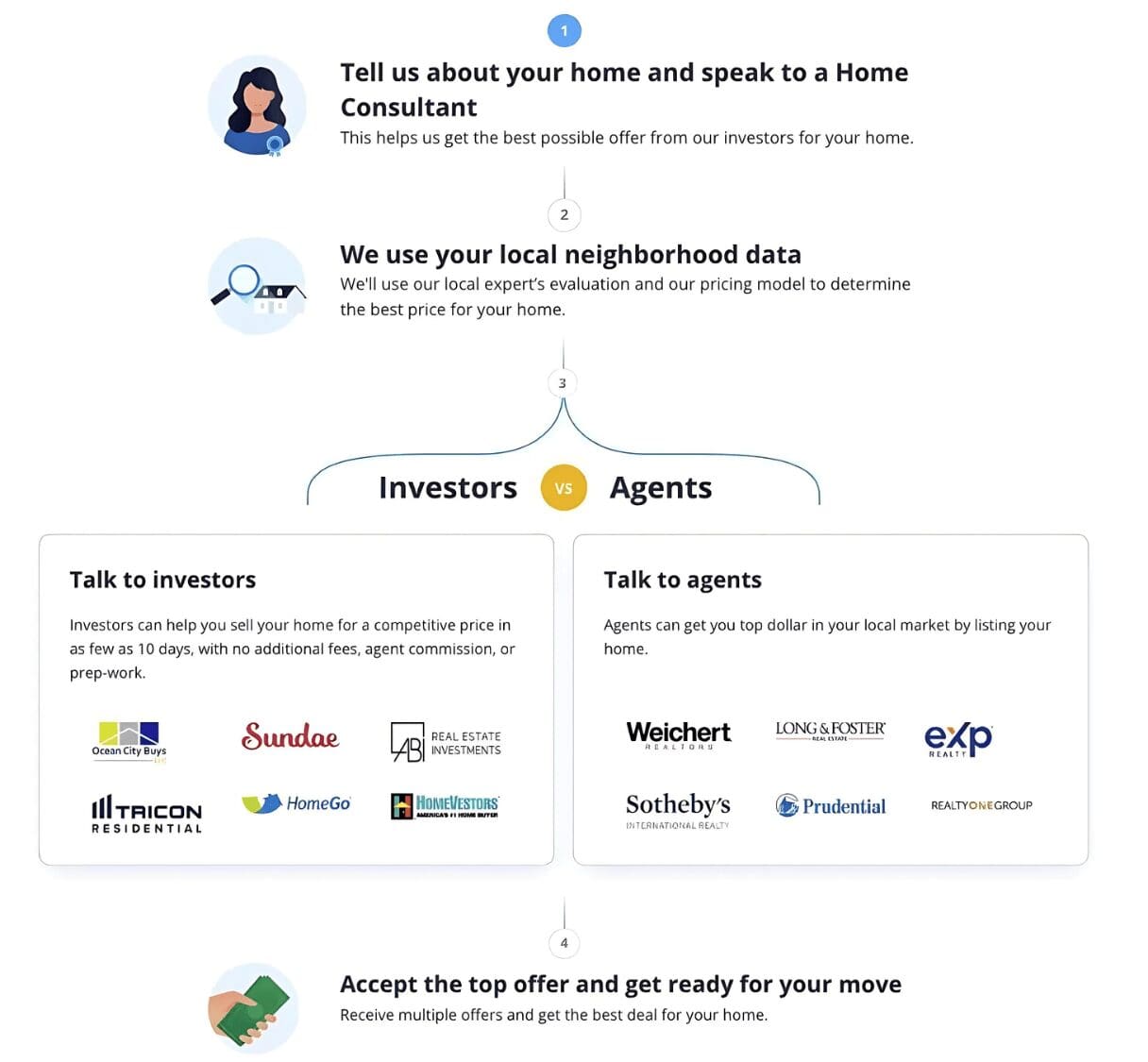 | No fees or Realtor commissions: Most companies cover closing costs | Not suitable for all situations: An agent-assisted home sale has advantages |