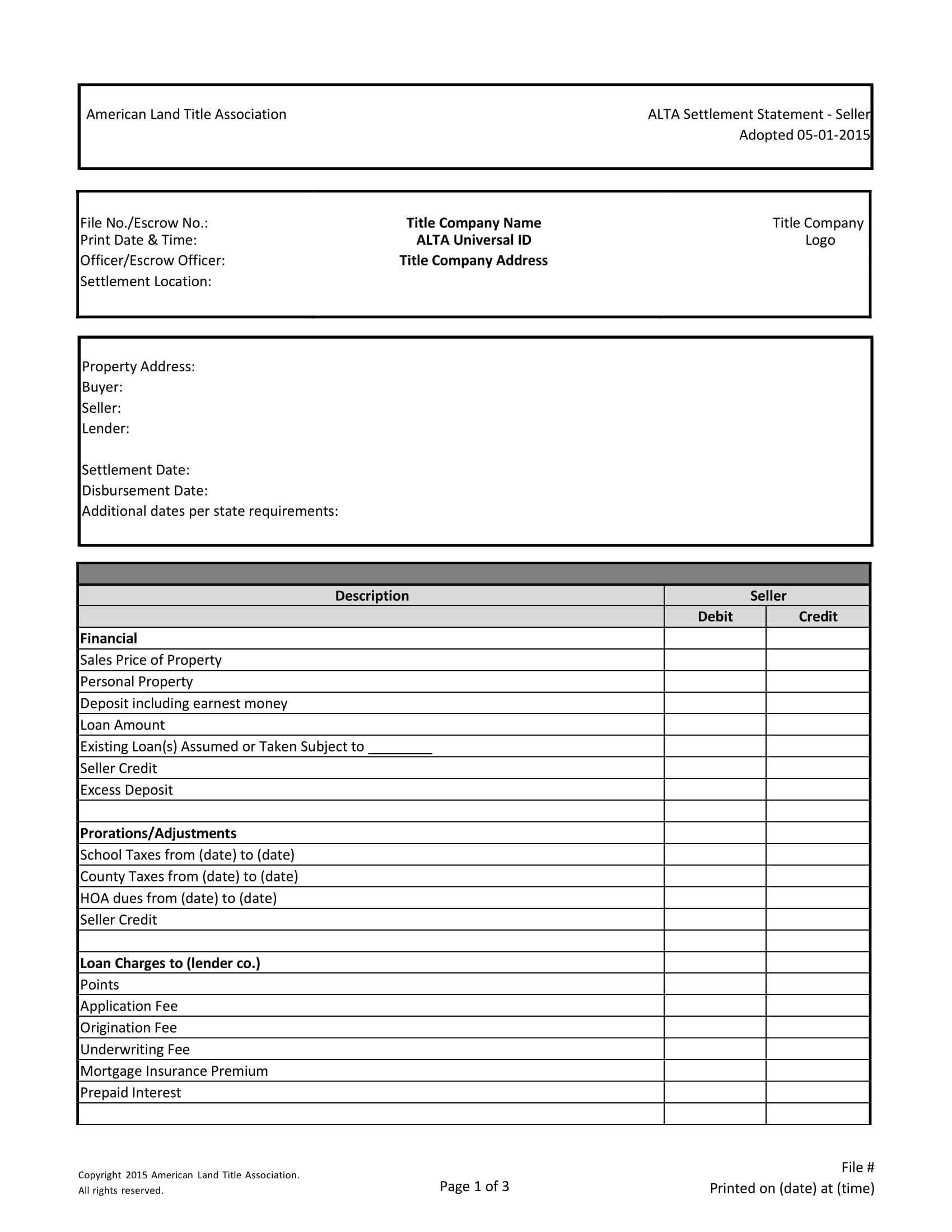 A standard settlement statement has a column for the seller’s debits and credits on one side, a column for the buyer’s debits and credits on the other, and a description of the charge in the middle. Below, we use the ALTA form as an example and break it down, line by line.