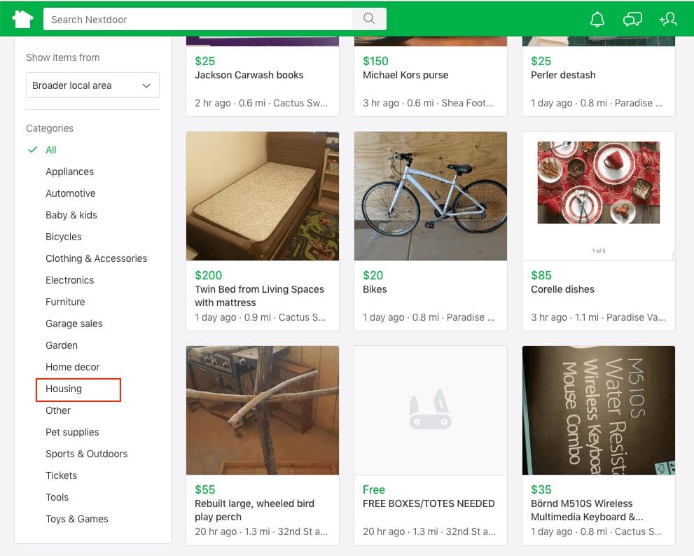 The organization of Nextdoor’s For Sale Free section is dependant on those posting to properly categorize. If someone decides their bike or Corelle dishes are “housing,” (as someone did in the screenshot) and posts these items in the housing category, there is nothing stopping them (except eventually the neighborhood moderator if they spot it). This means when people view the For Sale Free Housing section, it’s got more variety than you’d think.