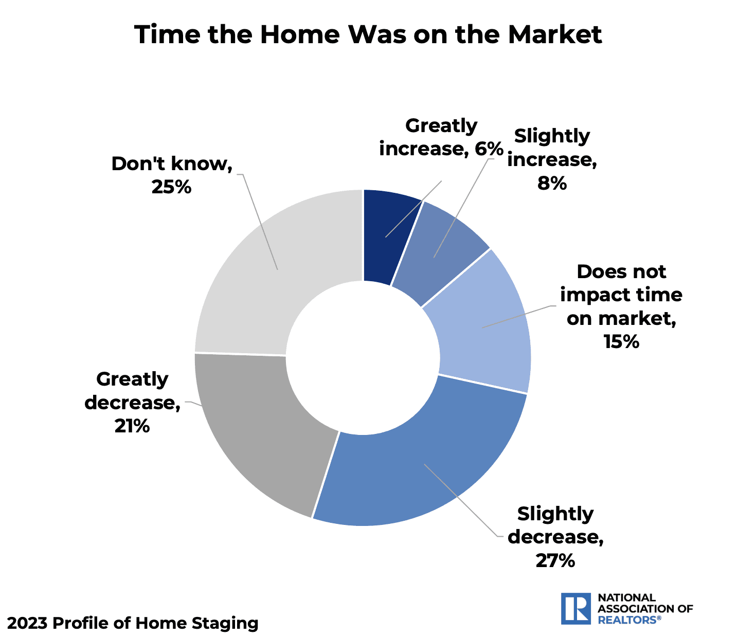 According to the NAR’s 2023 Profile of Home Staging, 27% of surveyed sellers’ agents reported that staging reduced the amount of time homes spend on the market. Additionally, 81% of buyer’s agents said that home staging helps buyers to visualize a property as their future home, and over half said that staging has an effect of most buyers’ view of the home most of the time.