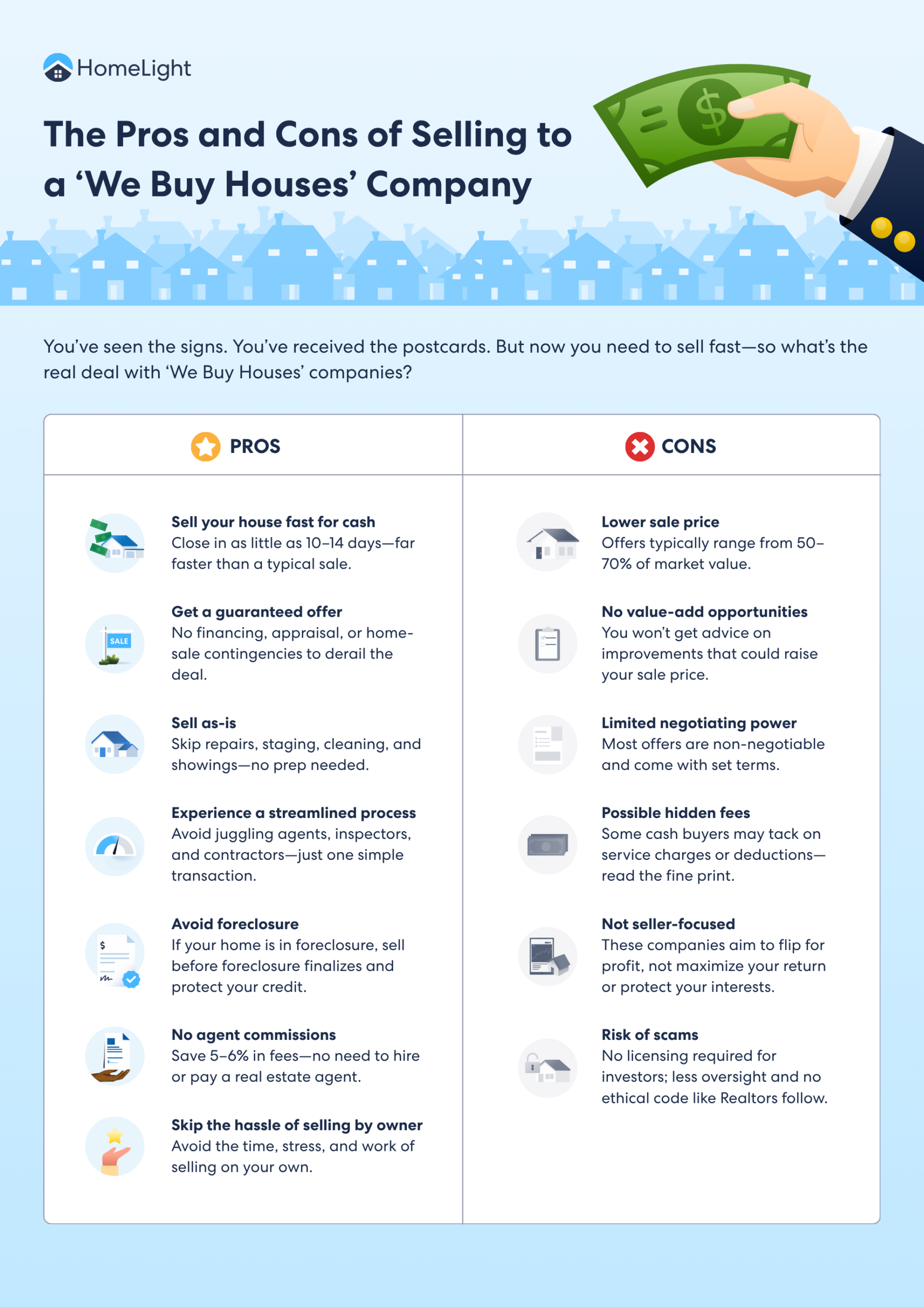 “We Buy Houses for Cash!” the billboard reads. “We Buy Ugly Houses!” says the postcard that shows up in your mailbox, along with a cute drawing of a caveman-looking character. You’ve seen these cash-for-home signs and received their mailings for years, but now you’re in a situation where you need to sell fast, and you’re wondering — what are ‘We Buy Houses’ pros and cons?