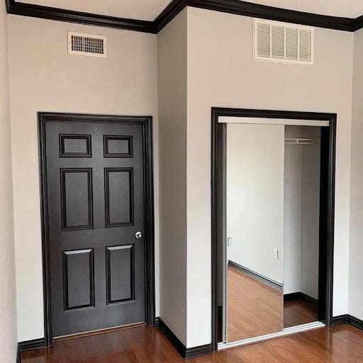 This sentiment is echoed by Matt Kunz, president of Five Star Painting, a Neighborly company, who says he’s seen an emerging trend where customers are opting for dark-stained wood trim and lighter walls. In the below example, the homeowner updated the trim and interior doors to a high-shine black, and it really pops against the cream-colored wall paint: