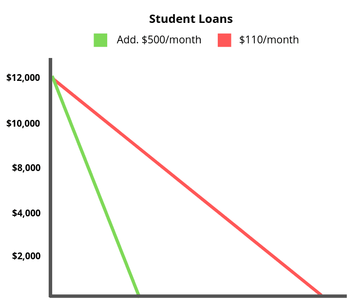 If you owe $12,000 in student loans with a 6% interest rate and a minimum $110 a month, you’ll spend 12 years paying it off. But, add an additional $500 each month and you’ll finish paying off the loan in less than a third of the time.