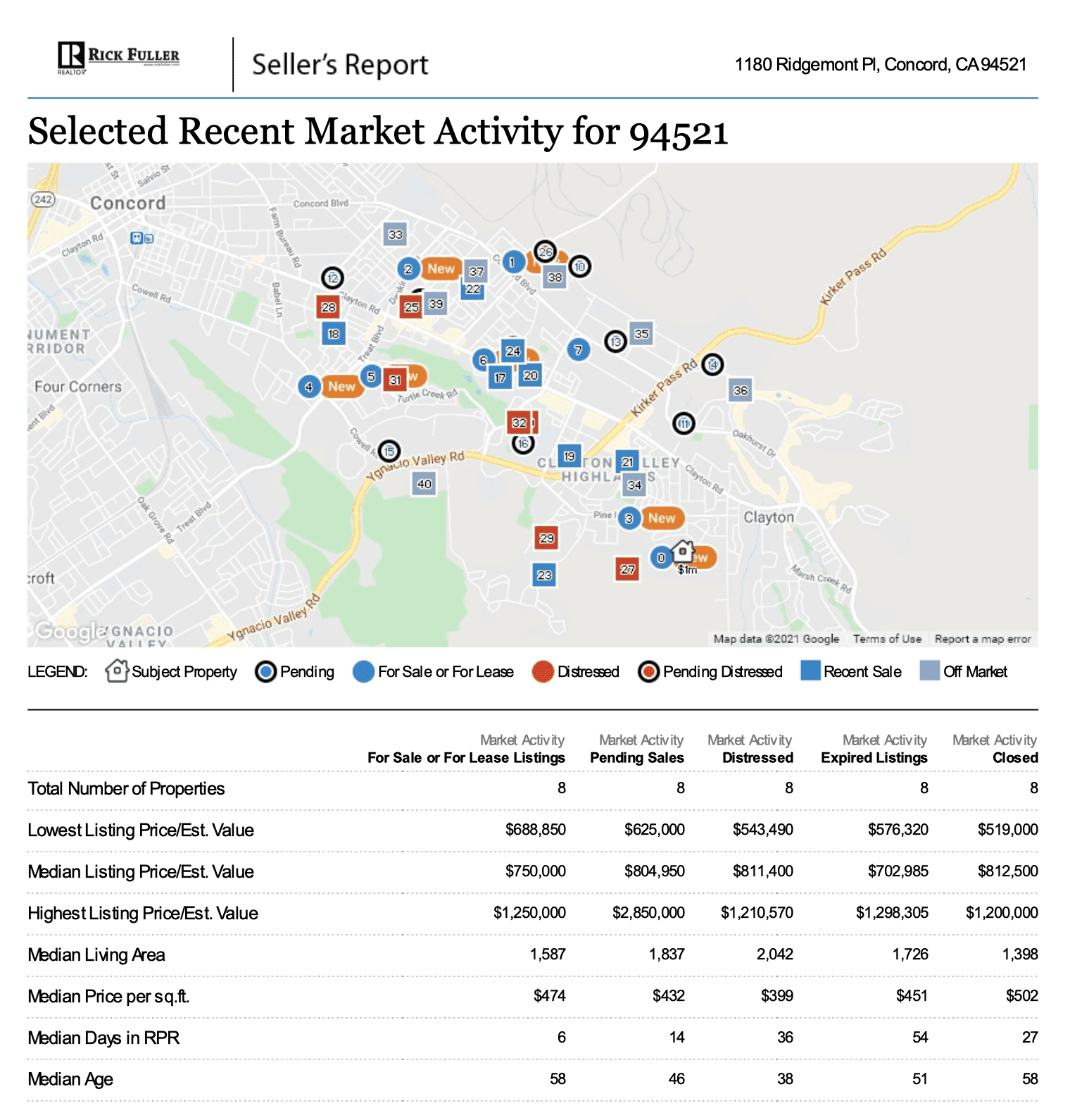 This section shows a map with a general snapshot of what’s been happening in the local market lately. The seller can easily see the total number of active, pending, distressed, expired, and closed listings, along with the low, median, and high listing prices. This overview also shows the median living area, price per square footage, and age of properties in each category.