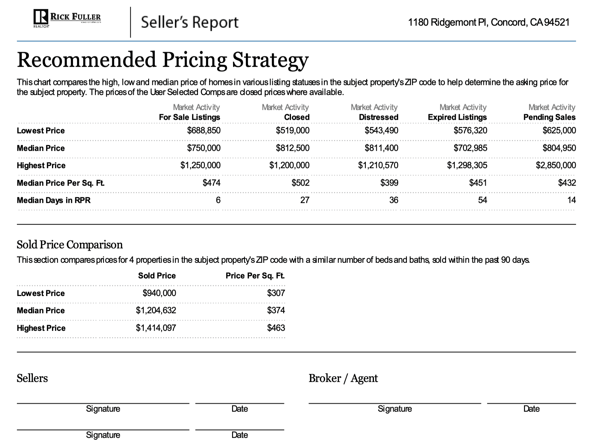 At the end of the CMA, Fuller includes a recommended pricing strategy based on the high, low, and median prices of all of the active, pending, closed, distressed, and expired listings in the CMA. He also includes a sold price comparison of the high, median, and low sale prices for several nearby properties.