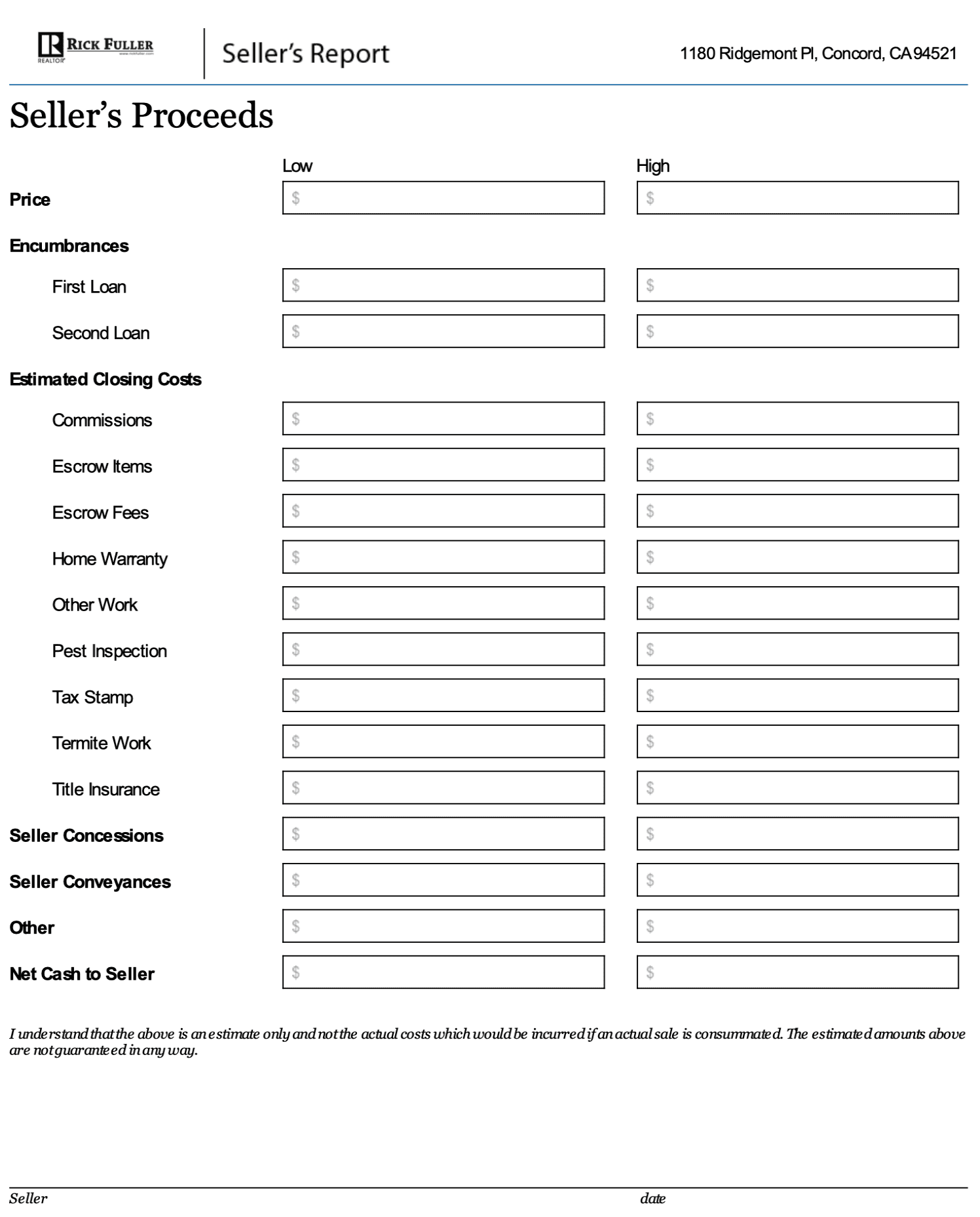 For the seller, the most important number is the amount of cash they’ll have after the sale closes. Some CMAs will include a worksheet to help the seller project how much their proceeds would be if the home sells at a low-end price and a high-end price, after deducting any mortgage balances, closing costs, concessions, and other fees.