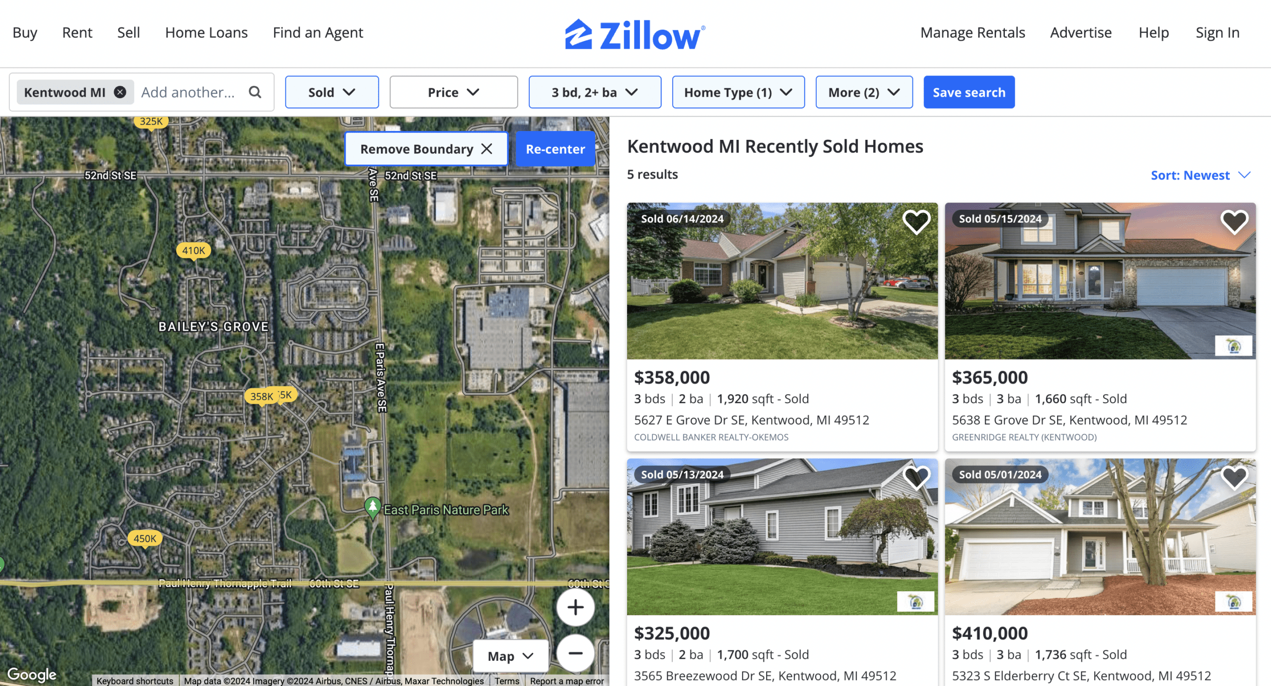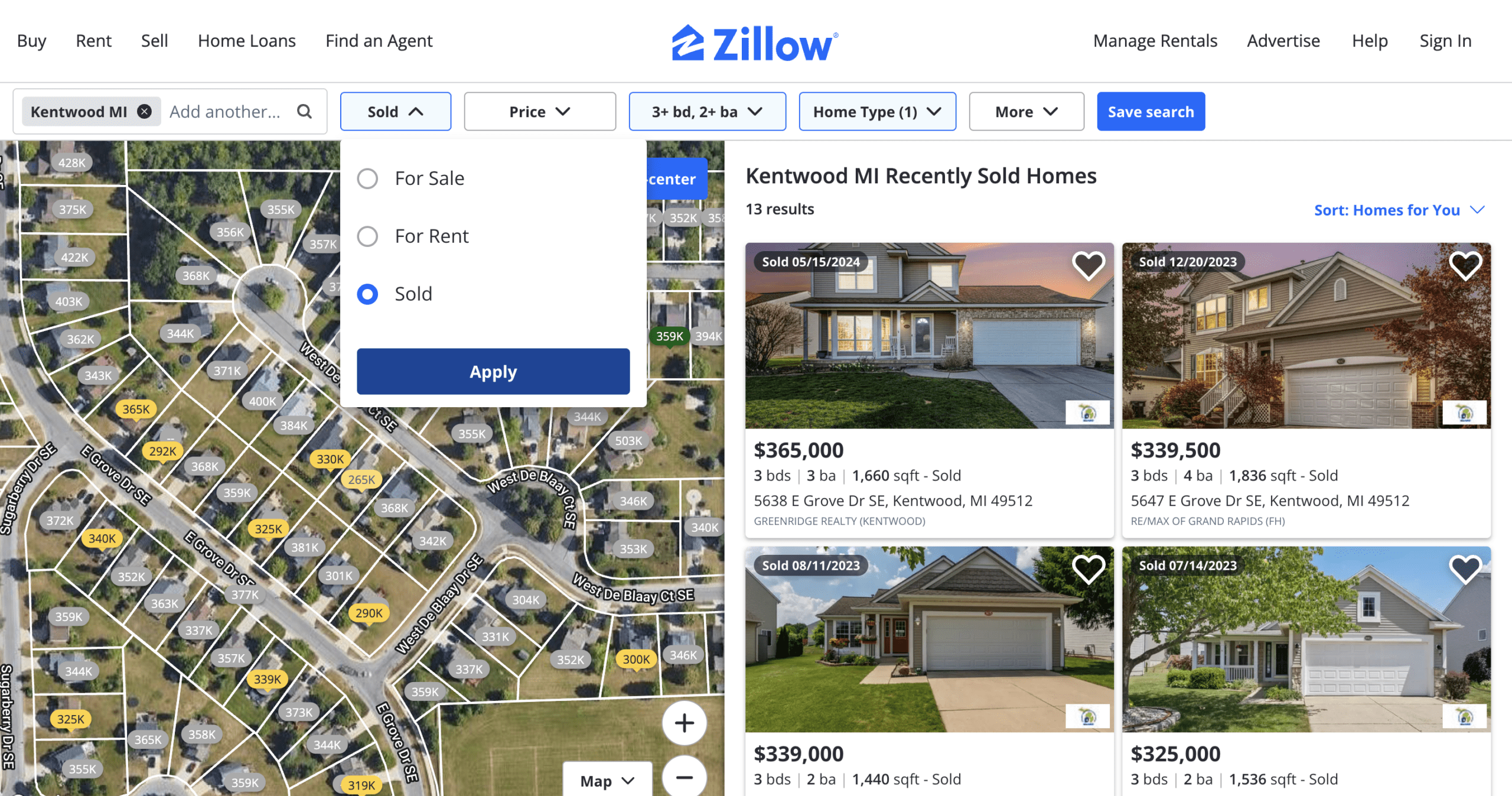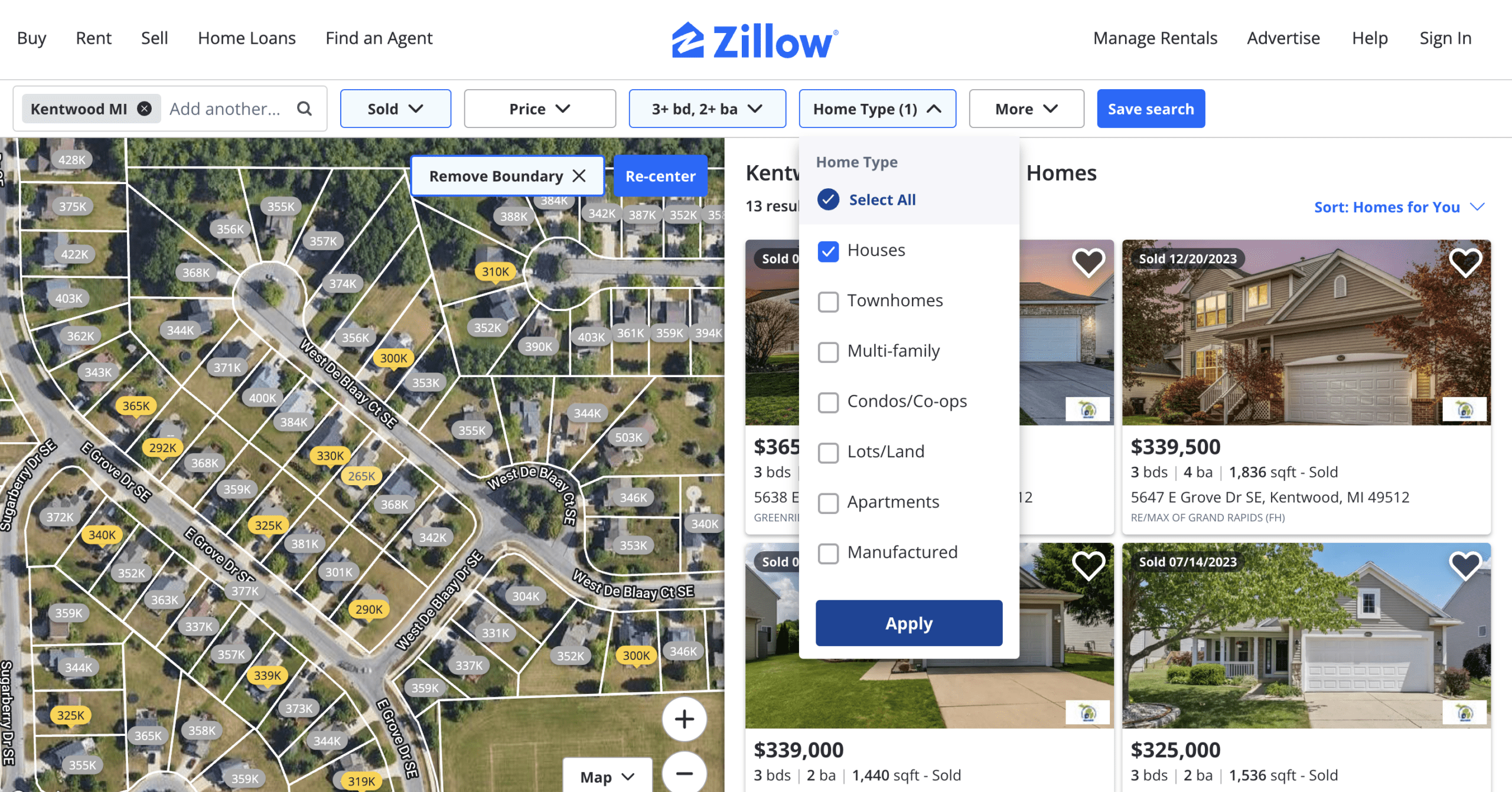 6. After hitting “Apply,” outcomes for “Recently Sold Homes” will appear on the right side of the screen.