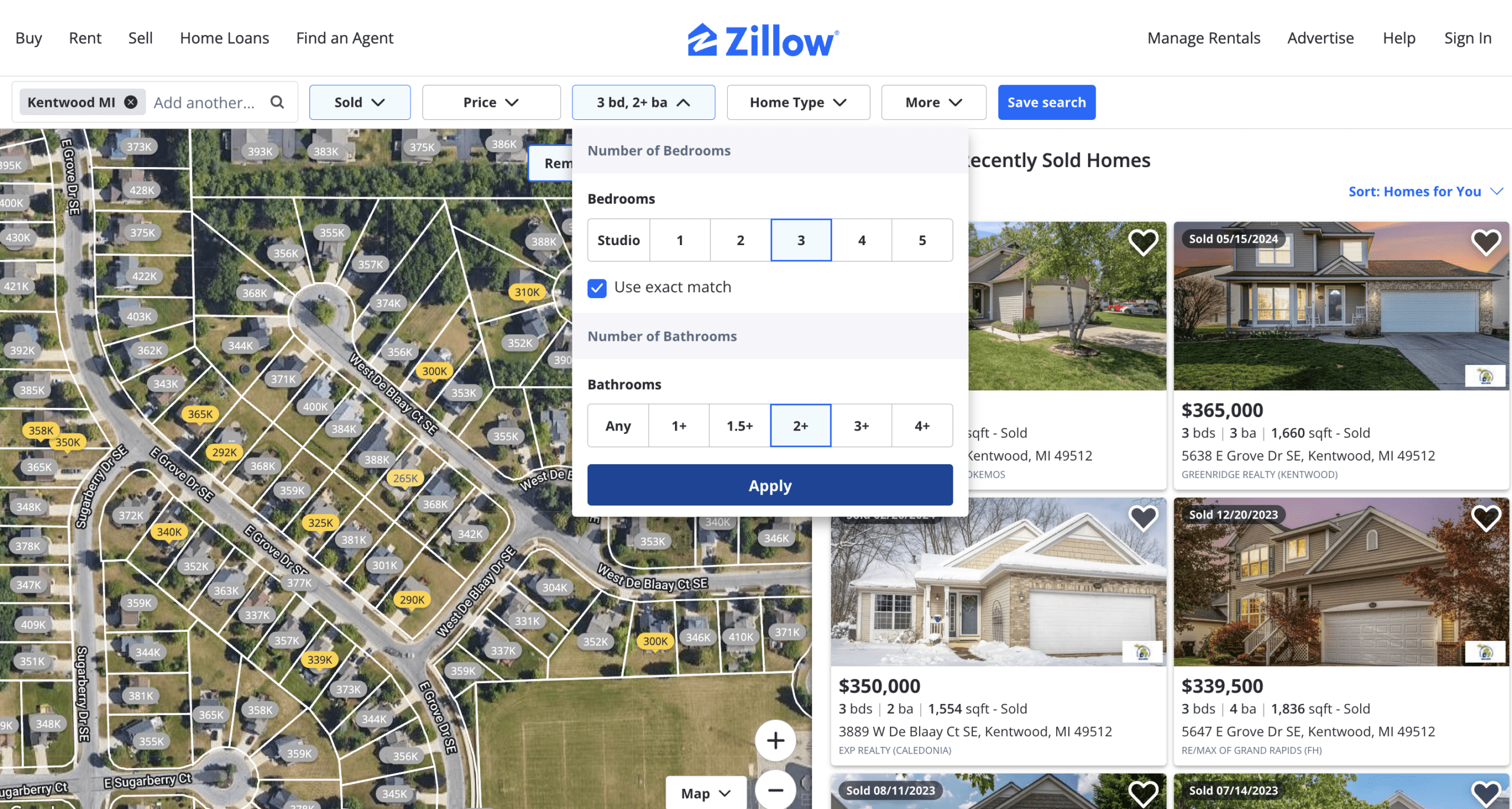 3. Then, click “Beds and Baths” from the top display bar, select the same number your house has (for this example, three bedrooms and two bathrooms), check the box for “Use exact match,” and hit “Apply.”