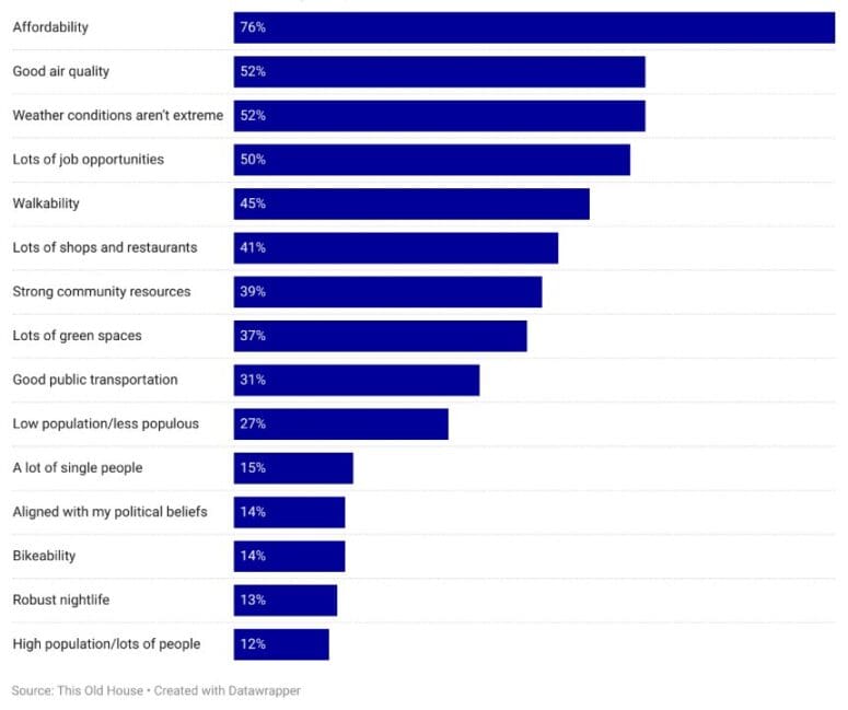 According to the study, affordability ranked No.1 on the list. Here are the 15 qualities that respondents said make a city a good place to start fresh, according to the This Old House report: