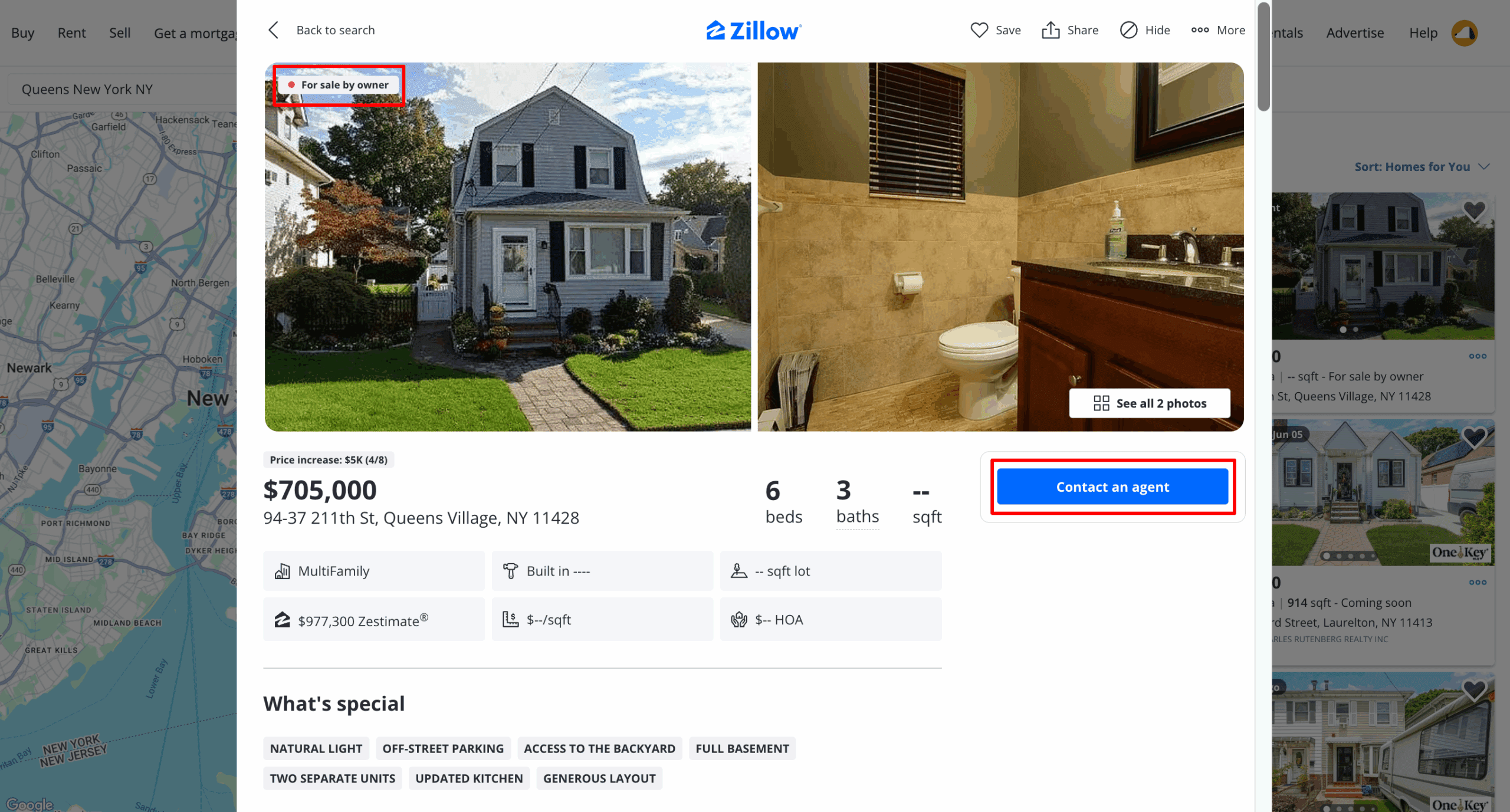 In addition, the interface may confuse buyers who do happen to find a FSBO listing. The property detail window features a prominent “Contact agent” button. The words “For sale by owner” are tucked in the upper corner of the home photo or in small print at the bottom of the description page.